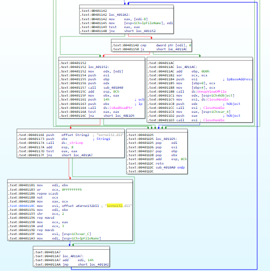 Once the string of “kernel32.dll” is overwritten with the name of the imposter DLL, the code jumps back to the point soon after the file mapping of the .exe (see the dark blue arrow in the code graph below). Therefore, this appears to be a loop that is likely looking for all references to “kernel32.dll” inside the code of the .exe and then replacing each of them with “kerne132.dll”.