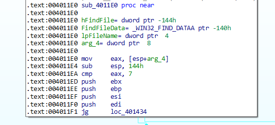 Therefore, “arg_4” appears to be the argument of “0” that was passed to this subroutine from the main function. We can see another argument at loc_4011E0 named “lpFileName”, and we can assume that this is equal to “C:\*”. We know that “arg_4” and “lpFileName” are arguments to this function, because their position in the stack is at a positive offset (8 and 4 bytes respectively - the green text to the right). We can also see “hFindFile” and “FindFileData” which are at negative offsets from the bottom of the stack, which indicates that those are local variables that will be used later on in the subroutine.