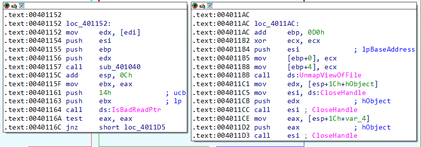 Later on, we see a call to “IsBadReadPtr”. This function verifies that the program has access to the part of memory that the pointer is referencing. As the malware is working with a file loaded in memory, and “MapViewOfFile” returns a pointer to the memory location where the file has been loaded, this might just be to check that the .exe file has been loaded successfully. Perhaps some .exe files found by the malware cannot be loaded by it into memory, so this is likely just used for error handling:
