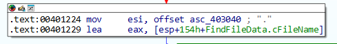 Looking around, it’s hard to immediately tell how this character will be used. We know that the code is currently trying to find a file in the directory, and finding files involves some additional processing. Perhaps the dot character is used to tell between the filename and extension. Unless we find any further evidence to the contrary, we can assume that it’s just used for string processing. There’s a similar block but with a double dot ASCII string (“..”) later on, and for now we assume the same.