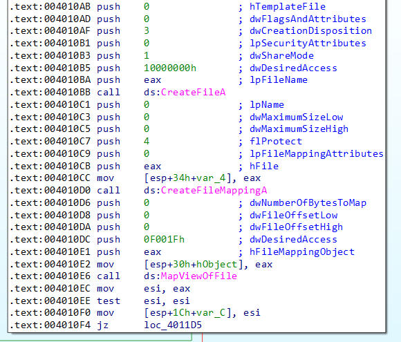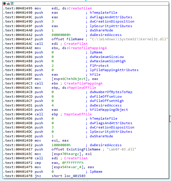 The second call is to “CreateFileMappingA” which acts on the “kernel32.dll” file handle that we opened with "CreateFileA” (you can see the handle being passed as an argument to “CreateFileMappingA” when EAX, which at this point still stores the return value of the "CreateFileA” function, is pushed onto the stack at loc_4014BE). The function “CreateFileMappingA” will create a file mapping of “kernel32.dll”. The file mapping will make the code of “kernel32.dll” accessible to our malware later on.