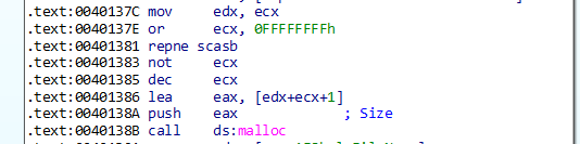 In this case, “repne scasb” is used to search for a NULL character within the string stored in EBX (this is the string from the previous code block that was compared to “kernel32.dll”). We can see that at loc_401181 EBX is moved into EDI, which is the register that “repne scasb” uses to search within. ECX is set to the maximum value at loc_401183, which will ensure that “repne scasb” will not stop until the NULL character is found. Once the NULL character is found, the instructions “not ECX” and “shr ECX, 2” modify ECX so that it reflects how many times the counter was decremented until the NULL character was found.