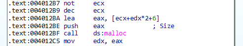 In the first big block in this subroutine, we can see a call to malloc (a function that allocates memory) with EAX as the argument (the argument indicates the size of the memory to be allocated). However, there’s plenty of operations on EAX prior to it being pushed onto the stack, making it hard to tell what value it holds. Running the program in a debugger and pausing it at this point could help us determine the value of EAX. Similarly, it’s hard to tell what the return value of malloc (a pointer to the newly allocated memory) is used for. As we’re not sure whether this function call will be of importance, we can continue for now and see whether we can understand the program’s function without it.