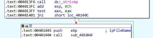 The subroutine “sub_4010A0” which does *something* with the found executables will take us to another window, so for now let’s remain in the current subroutine and examine the rest of it.