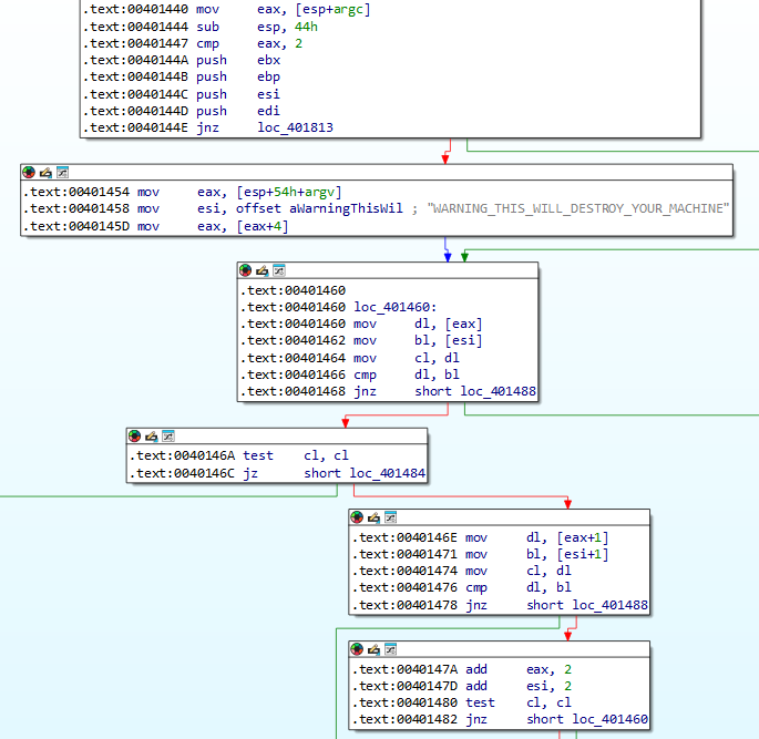 At loc_401466, the first letter of the second argument and the first letter of the warning string are compared. If they are equal (that is, the result of the comparison returns 0), we follow the red arrow to the fourth box from the top. If they are not equal, we follow the green arrow which leads to the end of the program.