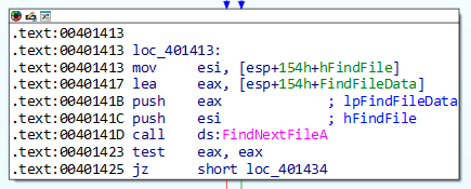 At the very start of this subroutine, “FindFirstFileA” was used to find the first file within the C:\ directory - however, this was only a singular file. If the malware is to find all of the executables, surely it must find more than one file within each directory. Attentive readers might have wondered at which point those other files are found, and here is the answer: